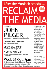 Then just a few days later, on Wednesday 26 October, I’ll be on the panel at the similarly named Reclaim the Media meeting at Bloomsbury Central Baptist Church, 235 Shaftesbury Avenue. This meeting, organised by NUJ activists, will also feature John Pilger, the world renowned investigate journalist and film-maker, Becky Branford, NUJ rep at the BBC, and Gary McFarlane, NUJ activist and part of the Tottenham Defence Campaign. This meeting is designed to bring people together to discuss and analyse the key problems within the industry that led to the hacking scandal of July.